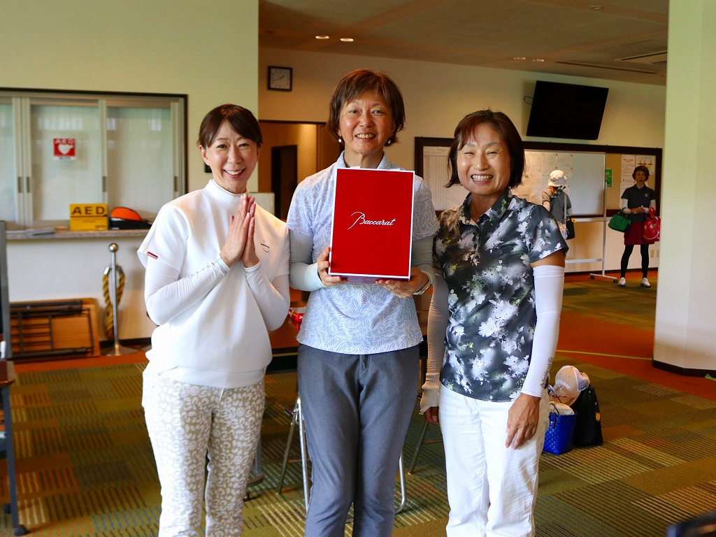 予選競技をトップで通過し、記念品を授与される濱田隆子(鶴舞)を中央に、同組の井智美(ワンウェイ、左)と落合美詠子(千葉、右)で記念の3ショット。