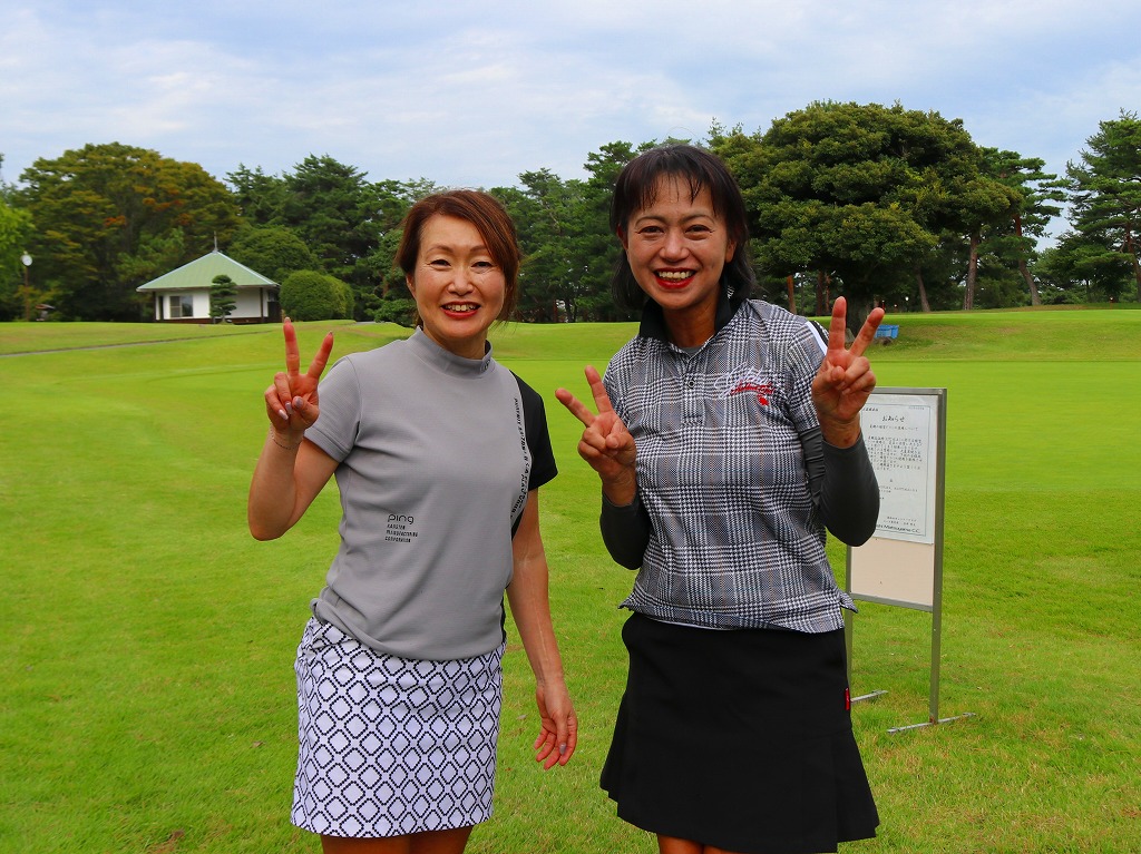 100人ほどの選手が競技を終えた段階で、暫定3位タイ(76ストローク)の久保田文子(鳳凰、左)。ホールアウト後に、同じ組でラウンドした鏑木友子(成田東、右)と笑顔の2ショット。