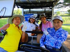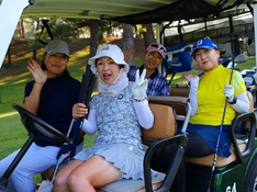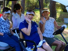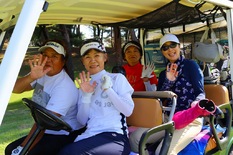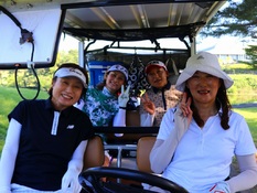 10番ティーから最初にスタートした第16組。ティーショットを終え、フェアウェイに乗り出す4選手。左から田羽美津衛(鹿沼プレミア)、細野ハヅ季(沼津)、宮本芳美(JGMセベバレステロス)、結城麻美(鹿野山)。