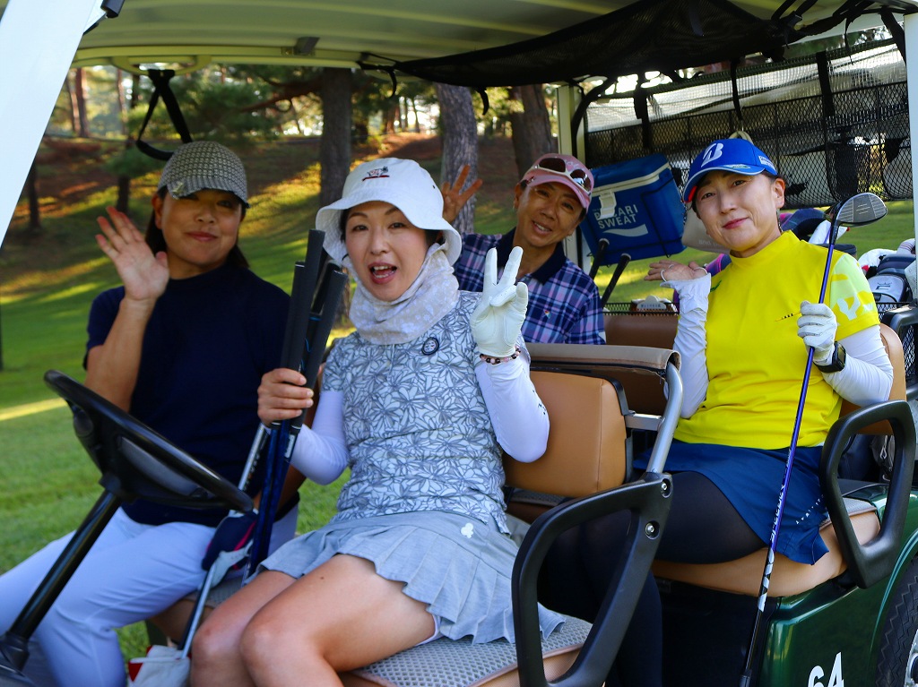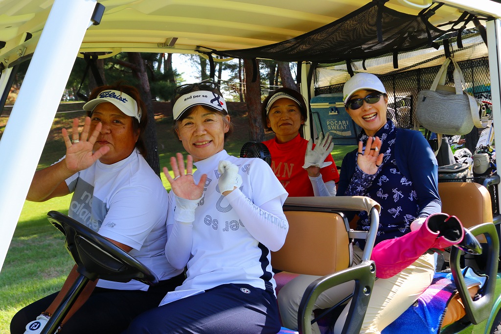 10番ティースタートの第28組の4選手。左から金子純(扶桑)、松山菜穂子(習志野)、岡安睦美(霞台)、尾ア靖子(東松山)。