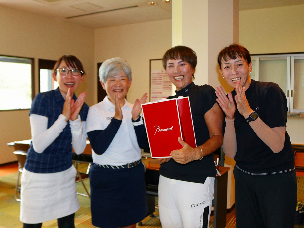 本年度の関東女子グランドシニア選手権を制した角田里子(鹿沼、左から3人目)は予選競技をトップの成績で通過。第1ラウンドの同伴競技者たちの拍手を受けながら記念品を受け取った。角田が予選をトップで通過した回数は、通算10回以上だろう。