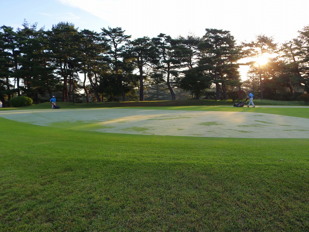 写真:今朝6時過ぎ、芝刈り作業が行われる練習グリーン