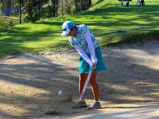 スタート前、アプローチ練習場でバンカーショットの練習に取り組む山口久美(総武)。バンカーショットは苦手なのか、「撮らないほうが……」という山口だったが、目標のピンにからむ、スピンの効いたショットを連発していた。