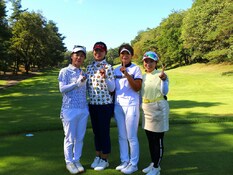 スタートのティーオフショットを無事終えて、笑顔でフェアウェイに向かう第3組の4選手。左から海老根君代(総武)、古見美帆(松本)、鈴木佐知子(京)、小森幸恵(ニュー・セントアンドリュース9.