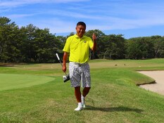 前半最後の9番パー5(499ヤード)で、第3打をピン右70〜80pにピタリとつけ、イージーバーディーをマークし、サムアップで応える相田昌樹(木更津)。間は最終組の2組前、第13組でラウンド中。