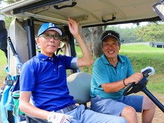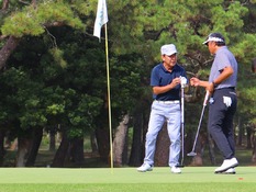 第12組でラウンドした上野雅之(相模原、左)は最終18番パー5で第3打がカップをかすめるスーパーショット。その後のイージーバーディーでトータル8オーバーで競技を終了。2位タイで入賞を果たした。写真右は平田泰博(沼津)。