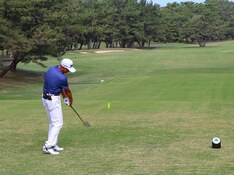 第14組でラウンドする渡辺勝秀(水戸グリーン)の1番ティーショット。