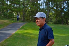 9番ホールを終えてハーフターンに向かう鈴木克彦(東名厚木)。前半は3オーバーパーの39。前日に比べてよりタフなホールロケーションを相手に、しぶといゴルフを続けた。