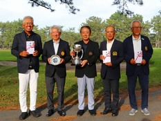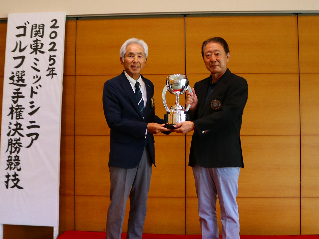 写真:内藤正幸KGA常務理事から優勝杯を授与される室野歩