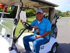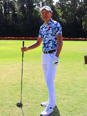 シーサイドリゾートコースにぴったりのシャツでプレーするMick Streit(塩原)。シャツと後方に見えるバッグは、自身がデザインしたブランド「Simple Ways」の商品。
