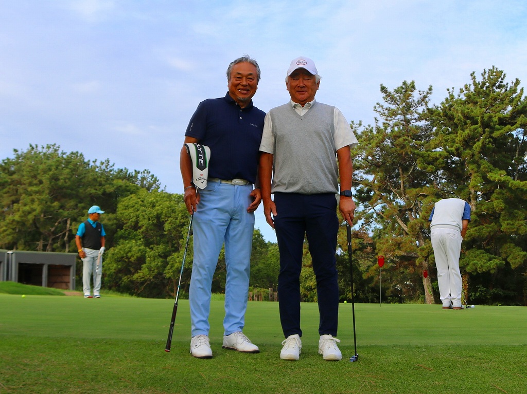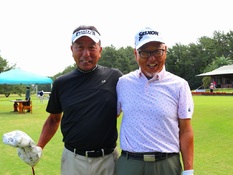 笑顔でいざ down the fairway! 鈴木正一郎(龍ヶ崎、左)と安藤秀二(浜野、右)。