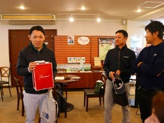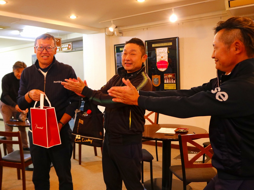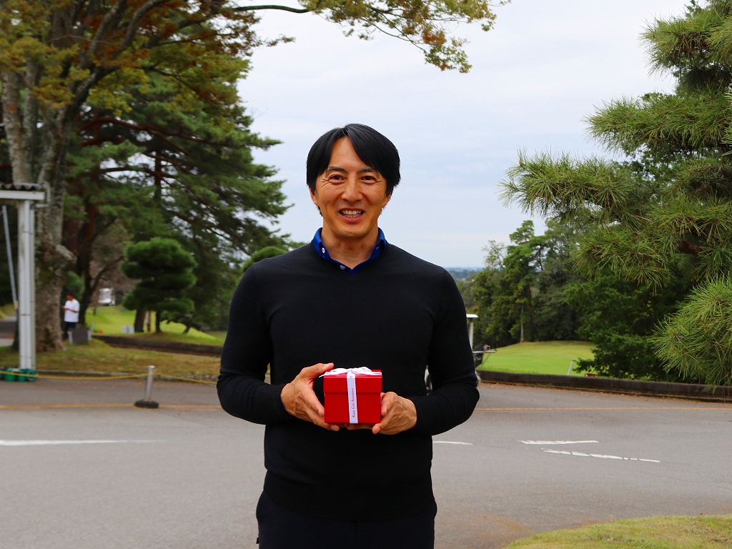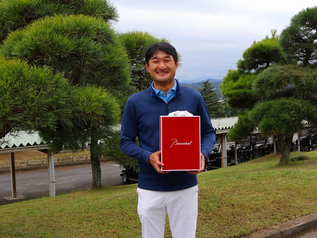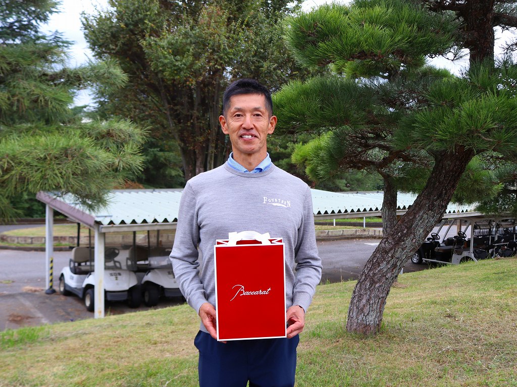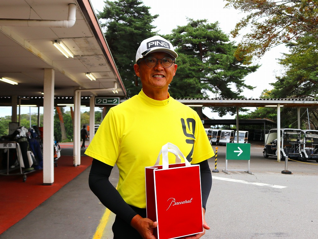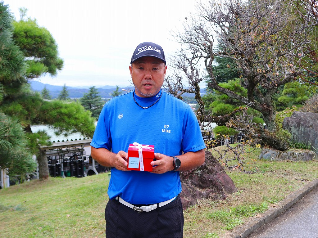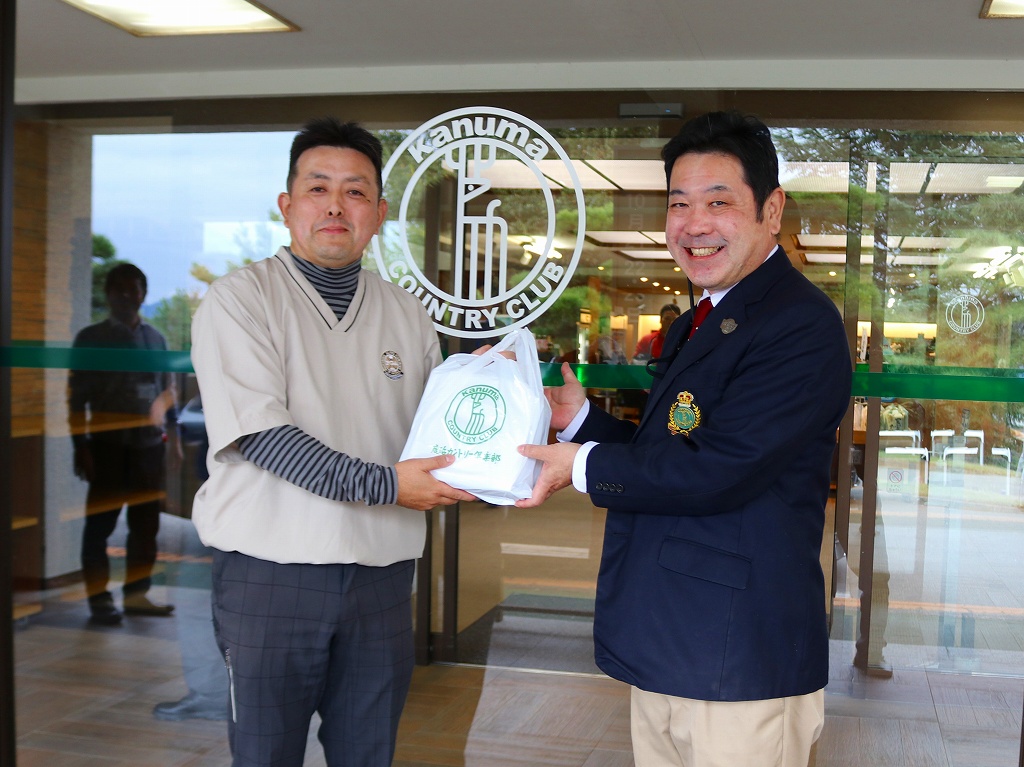 鹿沼カントリー倶楽部の金子勇一支配人から記念品を贈られた(写真上)。