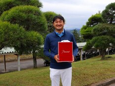 満面の笑みで、ベストスコア賞の記念品を胸にカメラに収まる服部昇平(土浦)。服部は袖ケ浦CC袖ケ浦コースにおける予選競技を69の好スコアでラウンドした。