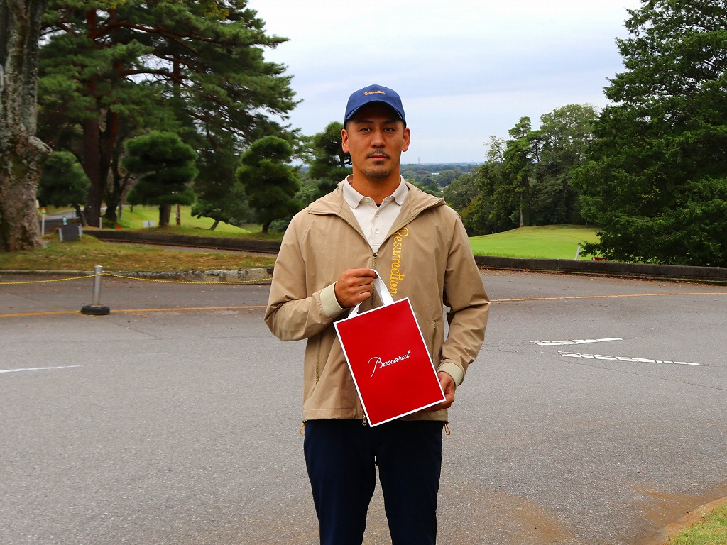 予選競技トップ通過の冨田俊貴(鎌ヶ谷)。今日のファッションに、ベストスコア賞のバカラの深紅のバッグがベストマッチ。今日は、北コースの1番ホールからスタートし、折り返し前の3ホールで3連続バーディをマークした。