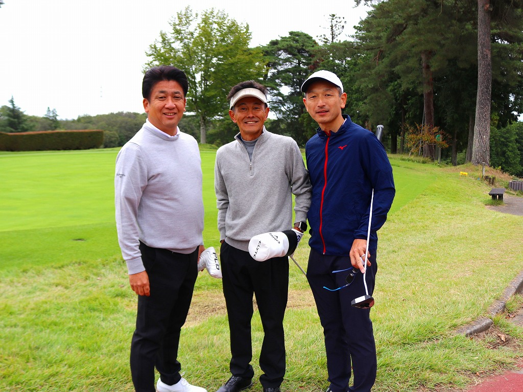 今日は南コースをラウンドする日体荏原高校卒のOB3選手。年は少し離れても、共通の話題で楽しい会話できると話す。左から坂輪茂章(浜野)、久田謙(武蔵)、久保谷和明(レインボー)。
