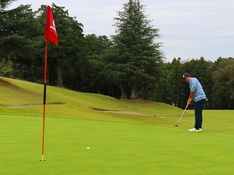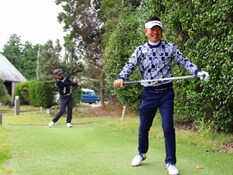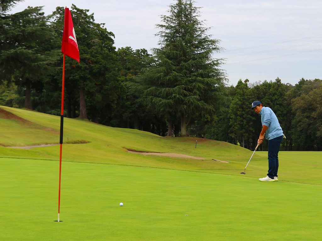 写真:9番ホール(パー5)で、長いバーディーパットを放った千北。このパットは残念ながら決まらなかったが、残り50pほどのパーパットを「お先に!」と沈め、このホールをパーとした。
